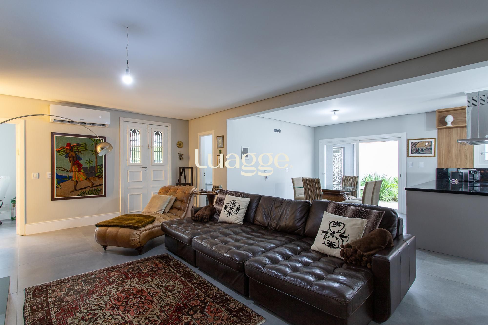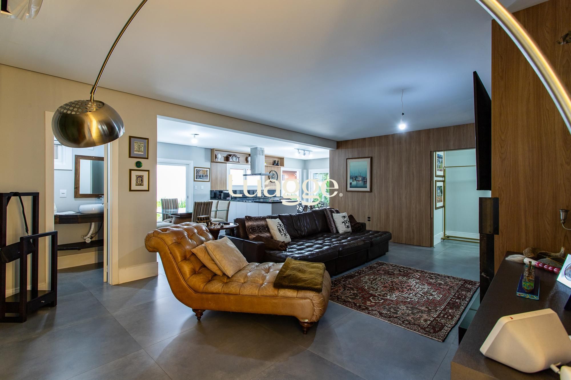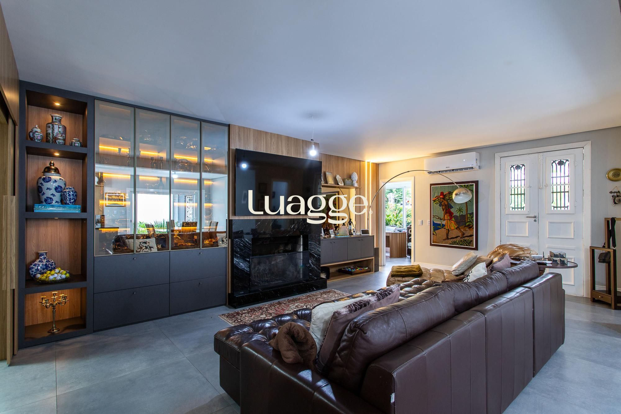 Amplo living com lareira e cozinha integrada.