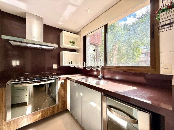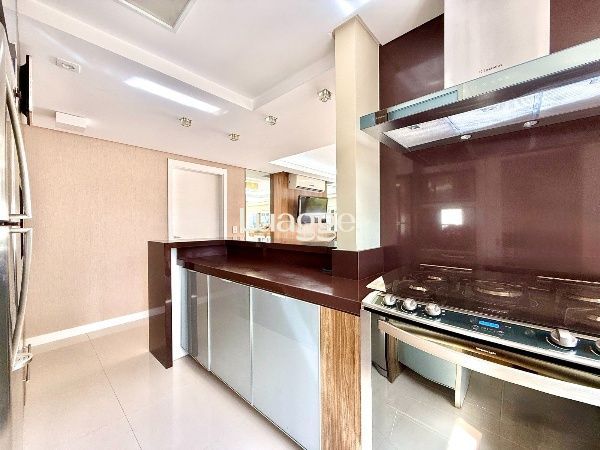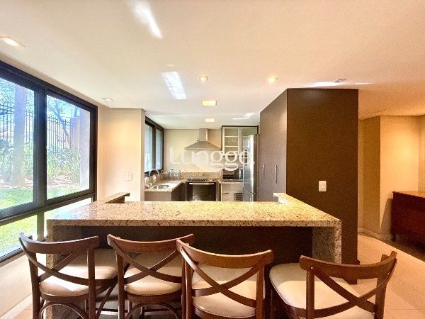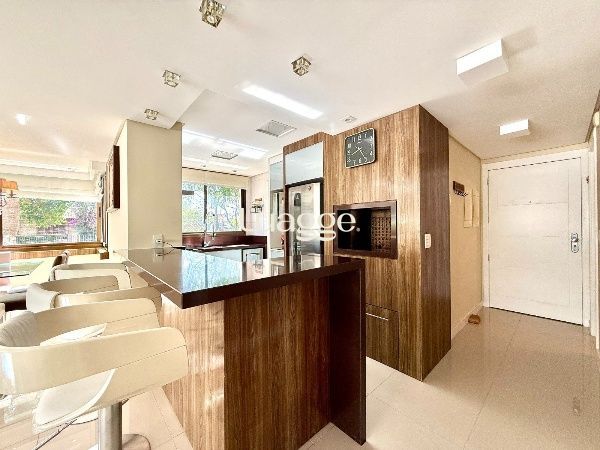 O living é amplo, com excelente iluminação natural e ambientes bem distribuídos para sala de estar e jantar, com piso em porcelanato e split. A cozinha em conceito aberto, com churrasqueira, integra-se à área social, criando um espaço funcional e ideal para receber. A área de serviço é separada, garantindo organização no dia a dia.