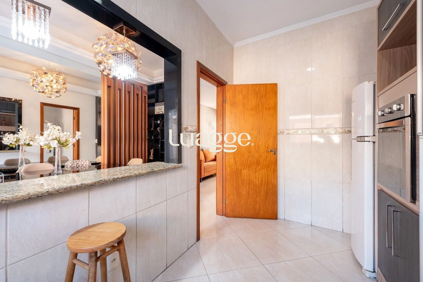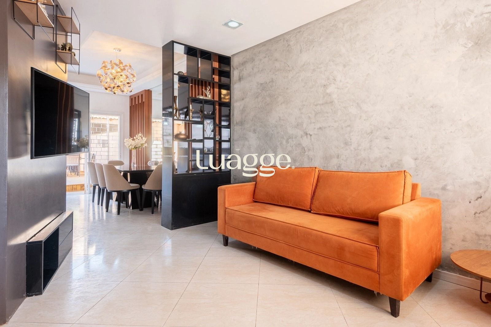 O living integrado às salas de estar e jantar cria uma atmosfera ampla e convidativa, ideal para receber e aproveitar o dia a dia com mais leveza. A cozinha americana planejada complementa o ambiente com praticidade e charme, enquanto o lavabo no térreo traz ainda mais comodidade à área social.