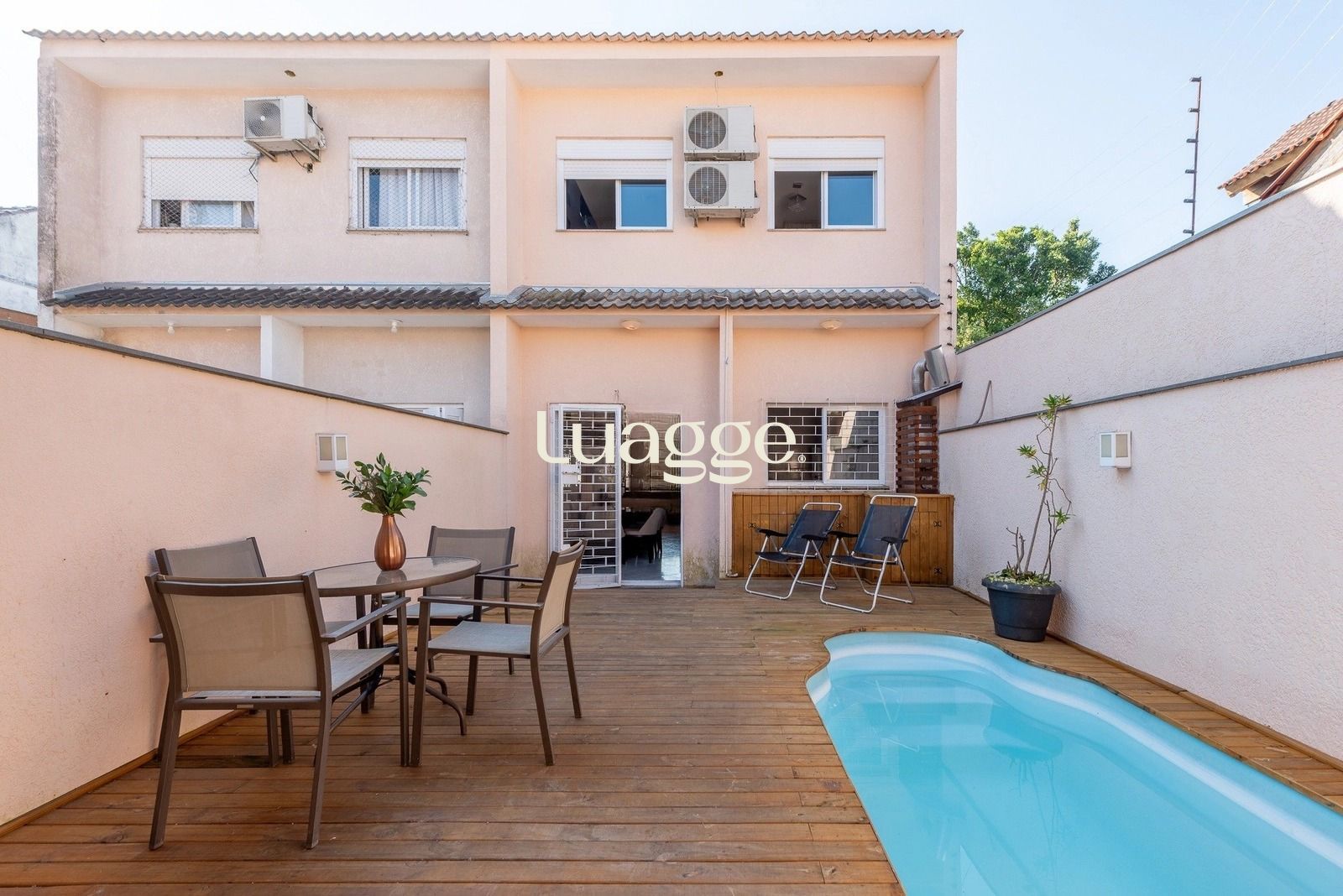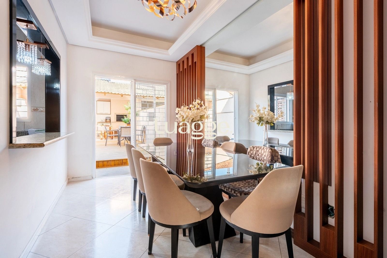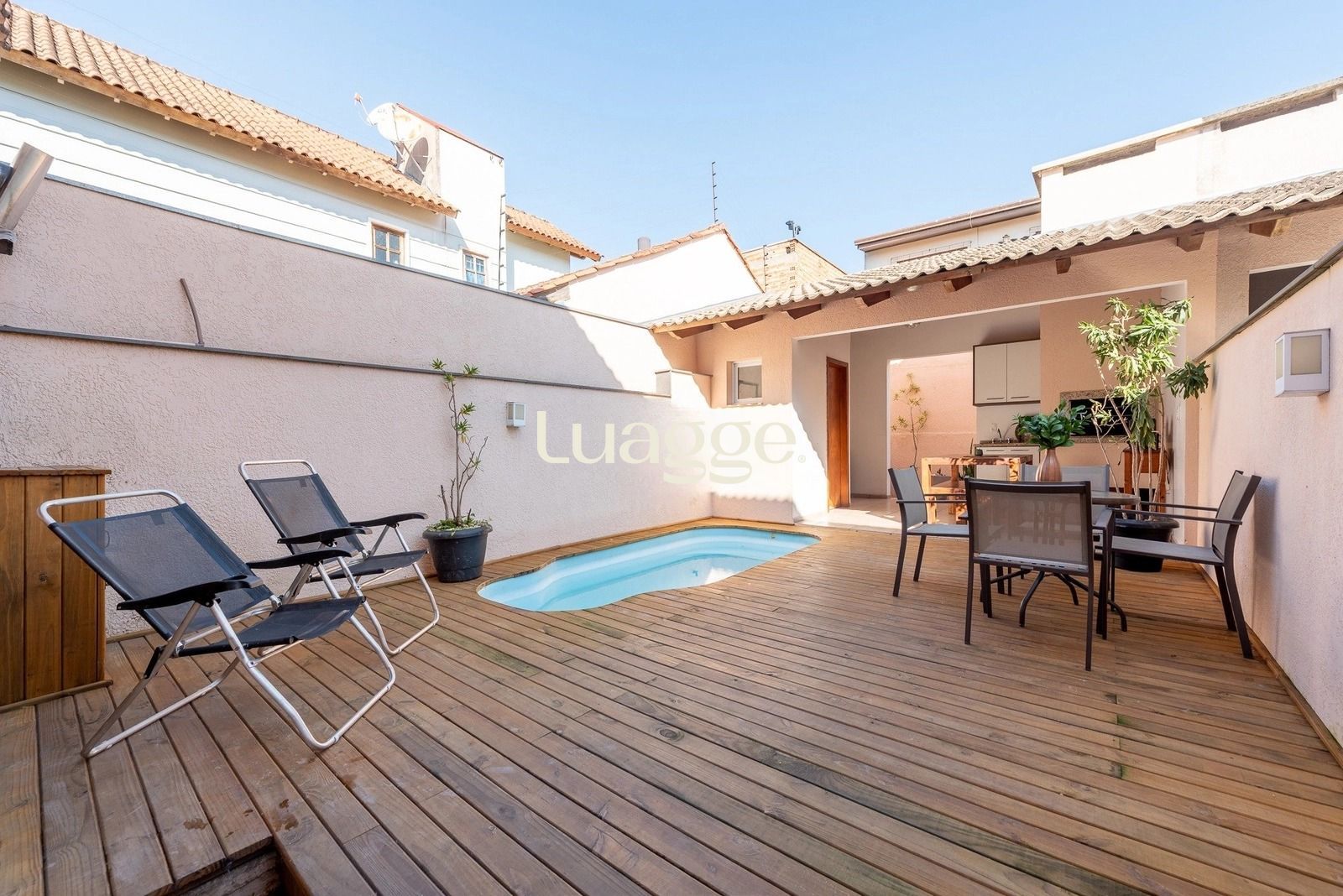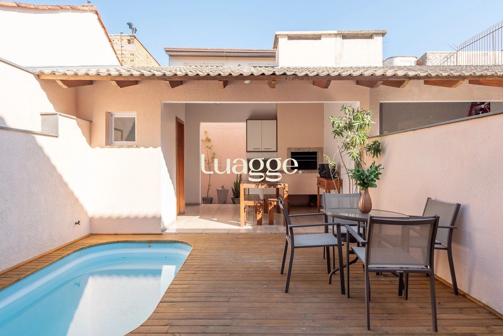 Nos fundos, o pátio surpreende com um espaço pensado para relaxar e aproveitar bons momentos. O deck em madeira valoriza a piscina e cria um ambiente perfeito para os dias de calor. A edícula completa, com churrasqueira, área de serviço e banheiro auxiliar, torna o espaço ideal para confraternizações e lazer com amigos e familiares.